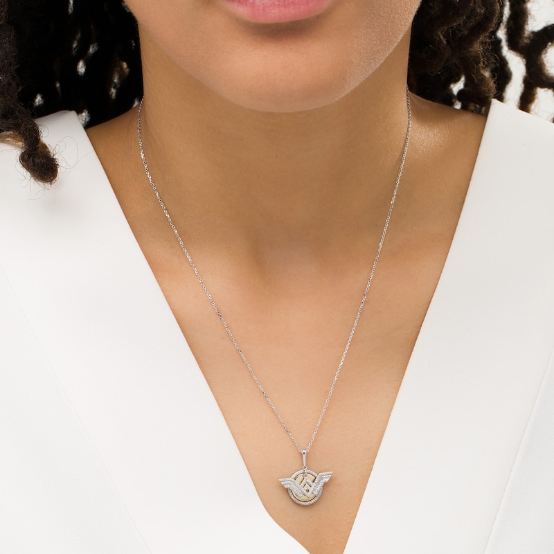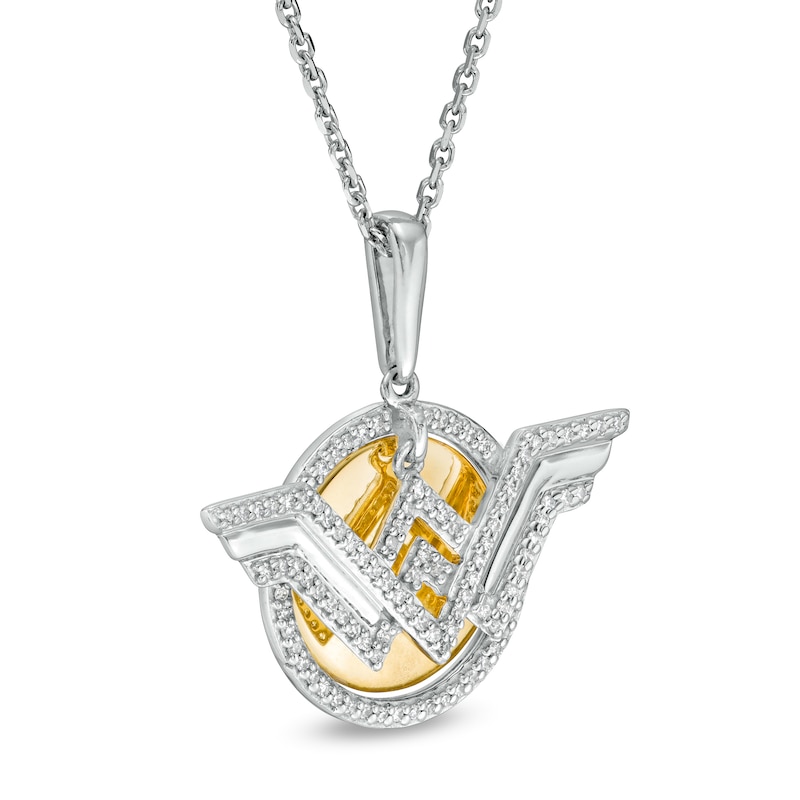 Crafted in sterling silver and 10K gold, this bold design features a silver "WW" logo dangle in polished and diamond-lined detail. In the background, a diamond-lined border surrounds a polished gold disc. Radiant with 1/10 ct. t.w. of diamonds and a brilliant buffed luster, this pendant suspends along an 18.0-inch cable chain, with an additional closure ring at 16.0 inches, that secures with a spring-ring clasp.This exclusive fine jewelry collection inspires you to wear your strength, confidence and power.