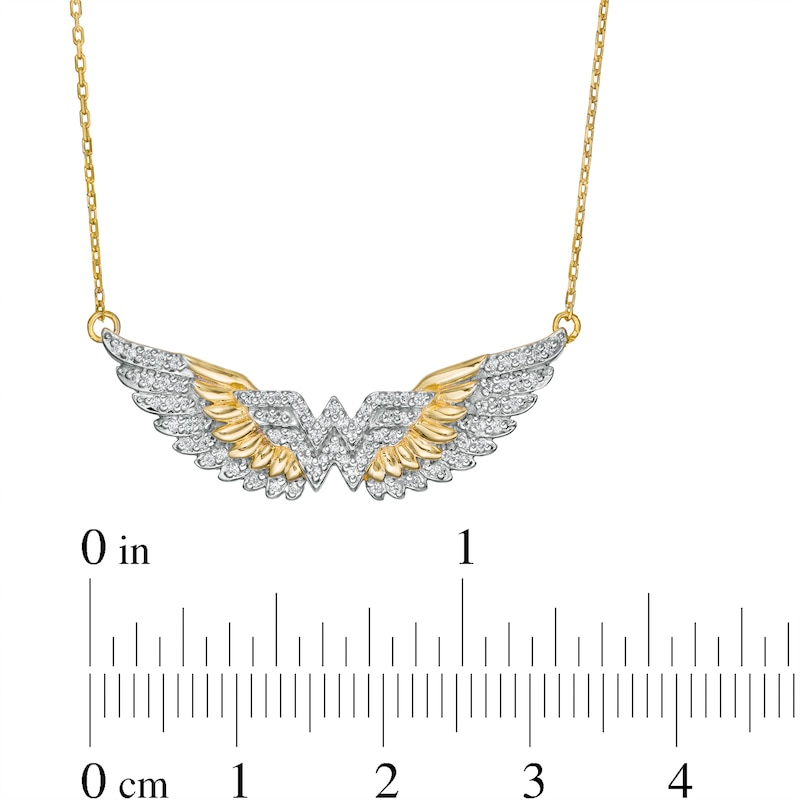 A striking style, this diamond necklace displays your confidence and strength. Created in warm 10K gold, this bold choice showcases the logo lined with sparkling diamonds. Highlighting the center, polished and diamond-adorned feathers shine in a layered wing design. Radiant with 1/4 ct. t.w. of diamonds and a brilliant buffed luster, this look suspends centered along a 16.5-inch cable chain that secures with a spring-ring clasp.This exclusive fine jewelry collection inspires you to wear your strength, confidence and power.
