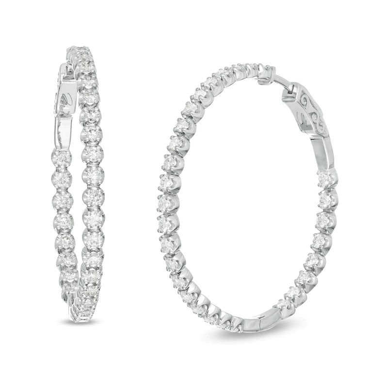 Add sparkle to your look with these gorgeous diamond hoop earrings. Crafted in cool 10K white gold, each exquisite earring features a row of 1/20 carat diamonds along the outer front and inner back edges, each set in a cupped four-prong setting. The earrings feature 3 carats of sparkling diamonds, polished to a brilliant finish, and fastened with a hinged back.