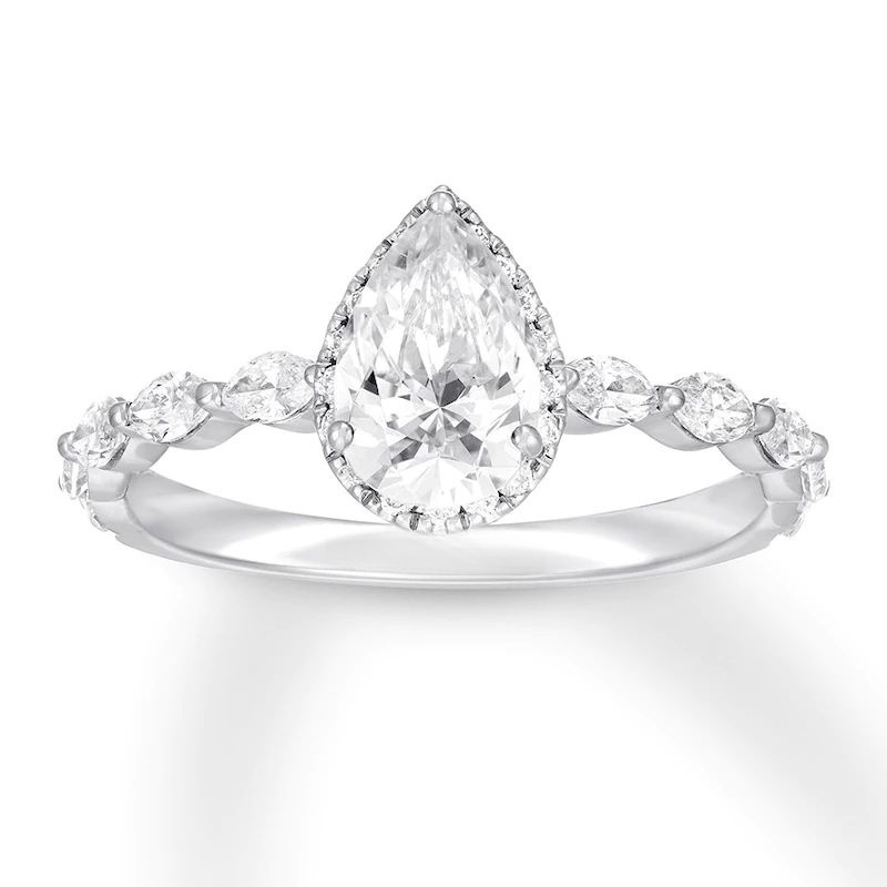 Engagement rings take stunning styles the jewelry designer is known for and elevate them with independently certified diamonds. This incredible ring displays a 1-carat, pear-shaped diamond traced in round diamonds as the brilliant focal point. Sparkling marquise-shaped diamonds dance across the band to complete the look. Fashioned in elegant 14K white gold, the ring has a total diamond weight of 1 1/2 carats.