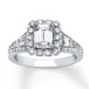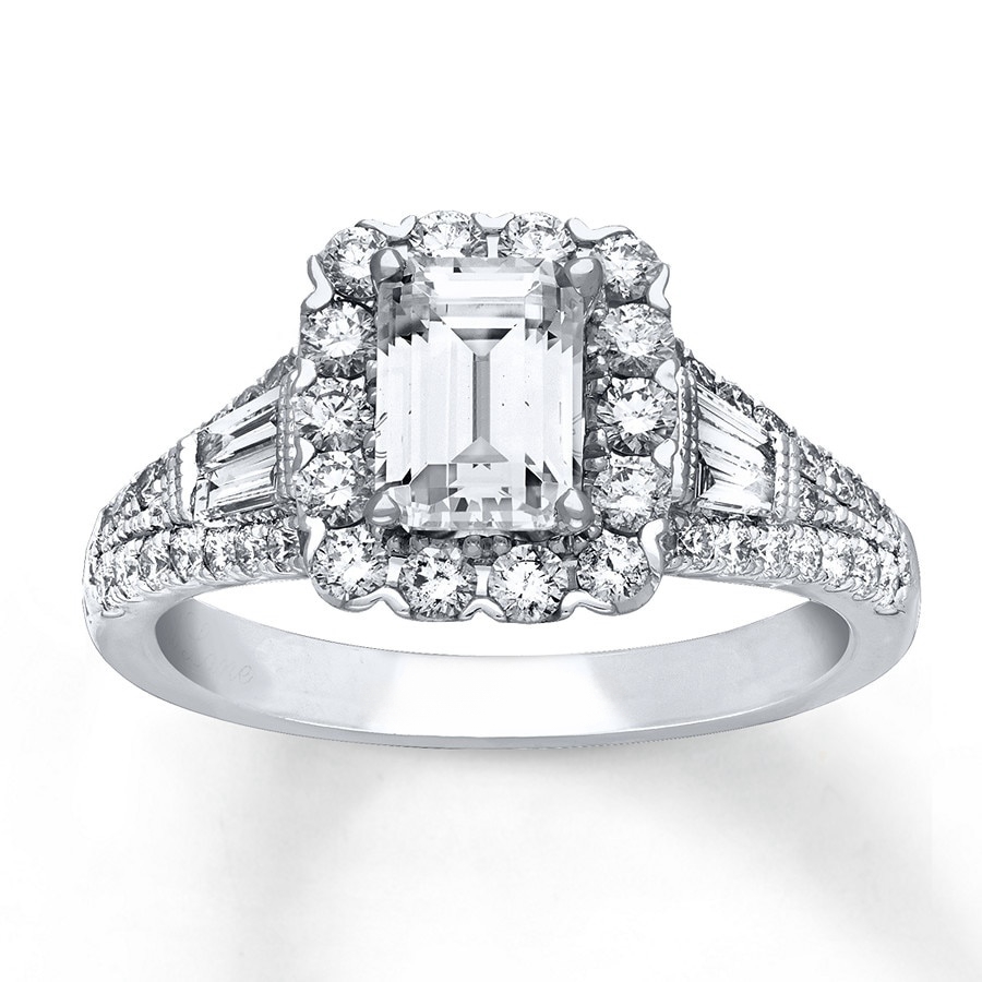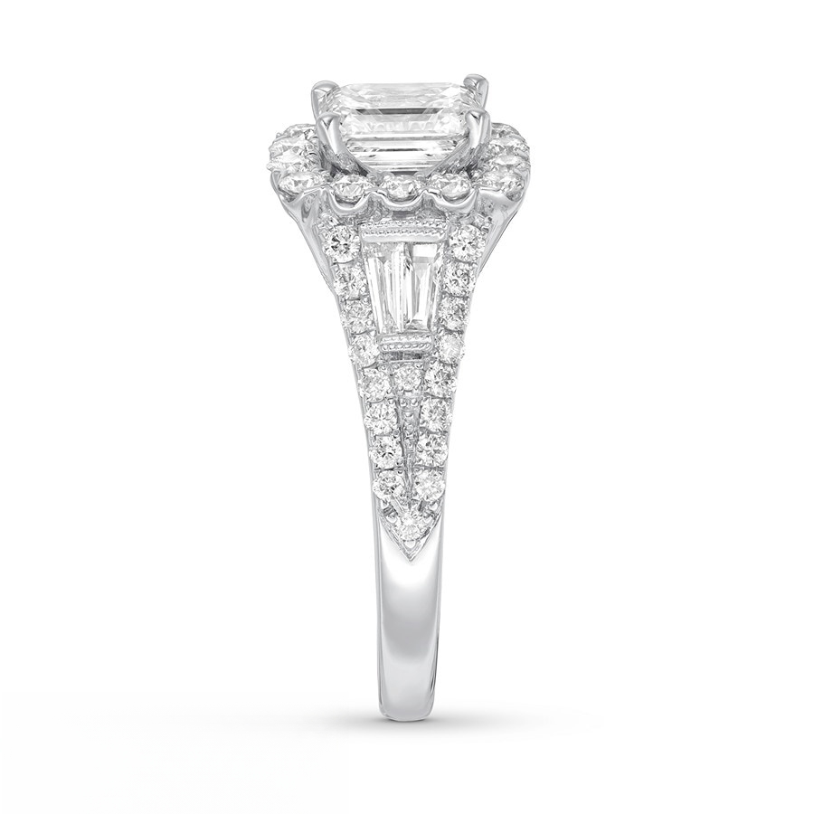 A stellar emerald-cut diamond is framed in lovely round diamonds at the center of this engagement ring. Baguette diamonds adorn each side of the center, with round diamonds flowing along the band of 14K white gold. The ring has a total diamond weight of 1 7/8 carats.