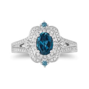 She’ll love every charming flourish of this divine gemstone and diamond engagement ring. Fashioned in 14K white gold, this design showcases a 7.0 x 5.0mm 70th oval-shaped London blue topaz wrapped in a diamond halo. Adding elegant detail, diamonds and a pair of round London blue topaz adorn the ornate outer frame. The diamond-lined lends further sparkle while crown insets lower down denote a princess-worthy style. Underneath the centerpiece, diamonds dot a scrolling carriage motif. Captivating with 1/4 ct. t.w. of diamonds and a bright polished shine, this engagement ring makes all her dreams come true.A Certificate of Authenticity accompanies this collector’s edition piece.